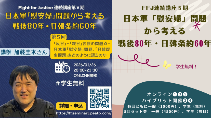 【Fight For Justice連続講座】第Ⅴ期申し込みスタート! 日本軍「慰安婦」問題から考える戦後80年・日韓条約60年